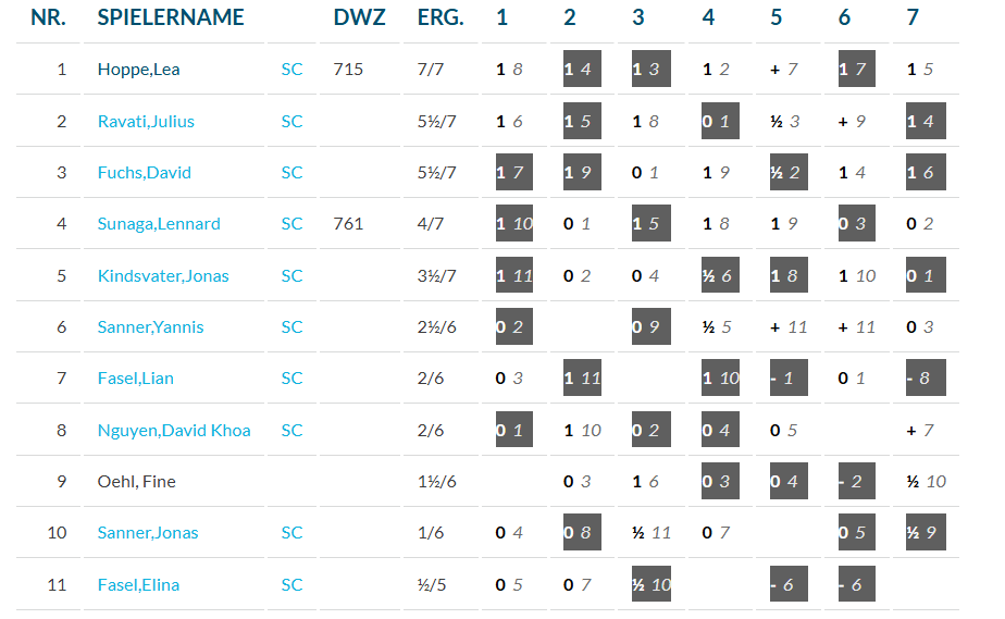 Einige hatten schon Erfahrung und erwartungsgemäß machten diese auch die Sieger unter sich aus. Souveräne Siegerin wurde Lea Hoppe, obwohl es doch einige schwierige Partien gab. Am Ende konnte sie mit großem Kampfgeist alle Spiele gewinnen. Dahinter kam Julius Ravati, vor dem punktgleichen David Fuchs ins Ziel. Sie verloren beide gegen Lea, spielten gegeneinander Remis und gewannen die restlichen Partien. Auf dem 4.Platz folge Lennard Sunaga, der auch als bester U10-Spieler geehrt wurde.